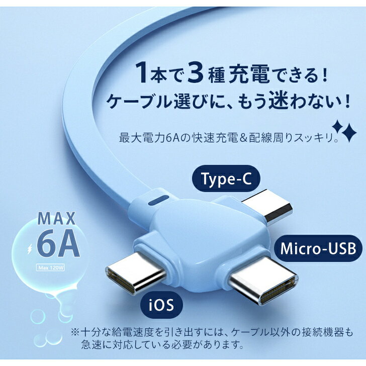 驚くほど多機能で可愛いおにぎり型の充電ケーブル。 3in1 巻き取り 105cm 6A 急速充電 ストラップ Type-C iOS